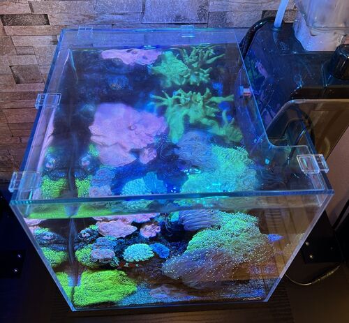 海水30cmキューブ水槽のサンゴ色揚げを目指すべく、ライトの変更を行いました。 「グラッシーレディオ RX122s Deep」+「VitalWave2 シアン」 光の波長を補完しあうことで「サンゴの蛍光タンパクを励起していこう!」ということです。 ボルクスジャパン グラ…