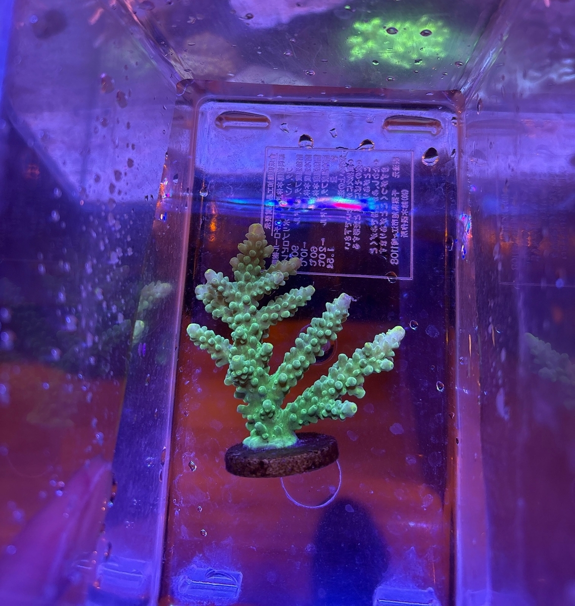 丈夫そうなミドリイシとして選びましたが、ウチの水槽に少なめの水色系(ややグリーン)が良い感じ。