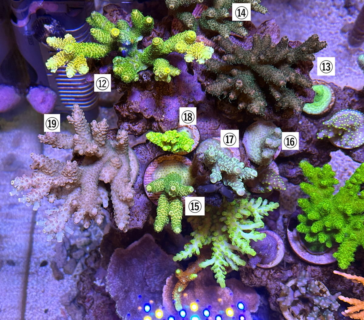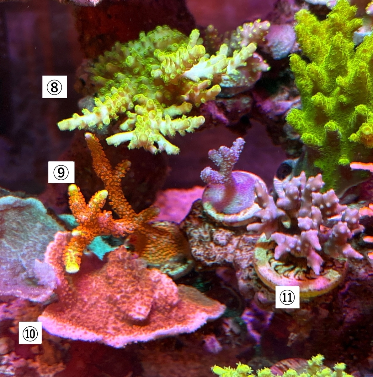 ⑩ ウスコモンサンゴ:欠片をライブロックに貼り付けたところから始まり、当初の成長スピードは早かったが、今は停滞気味