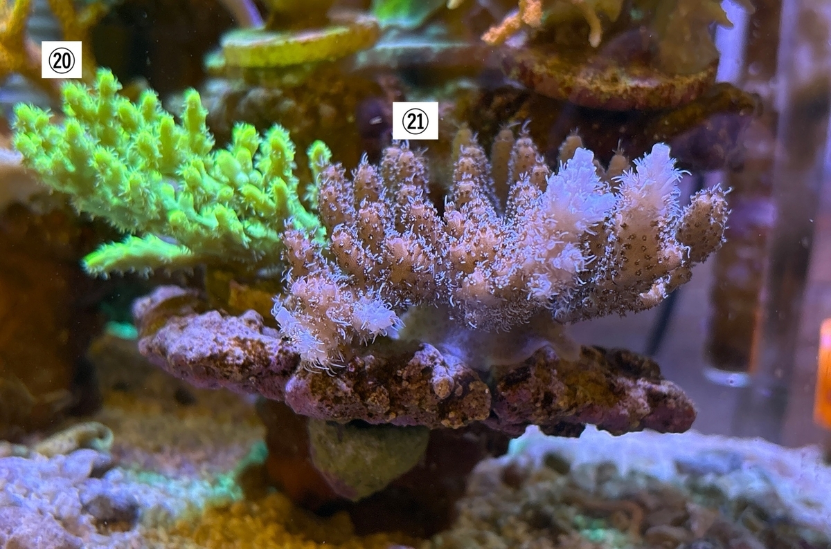 ㉑ クシハダミドリイシ:テーブル状サンゴは難しいというイメージだったが、このサンゴに関してはそんなことは無く、底上げで接着していたプラグを覆いつくした後、ライブロックまで浸食中。さらに右側から成長点が出て伸びている最中。色は当初ホワイトだったが、ライブロックに近い色に変化